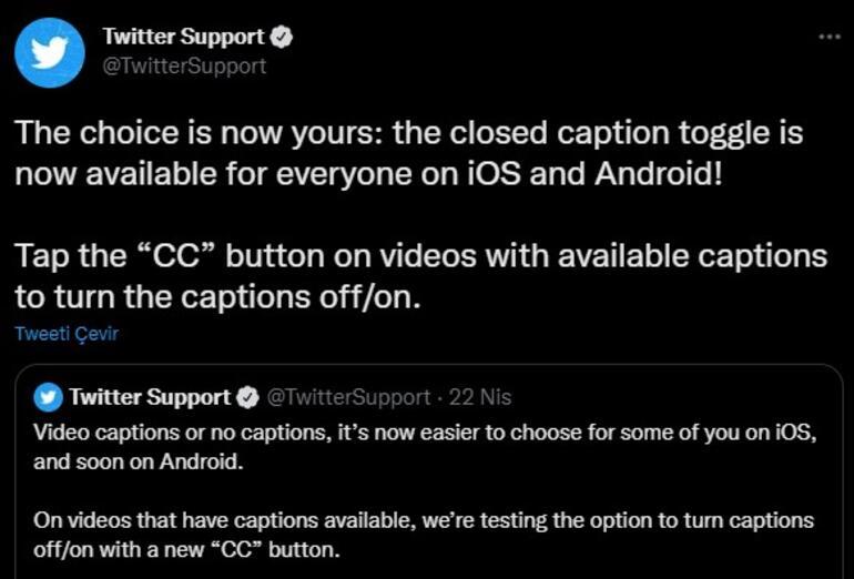 Buton, direkt Twitter videolarına entegre edilerek alt yazının açılıp kapanmasını sağlayacak. Yeni fonksiyon, özellikle görüntü ve ses kalitesi düşük Twitter videoları için oldukça yardımcı olacak.
